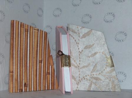 Forrado com papel artesanal e papel com relevo. Cores e padrões variados. |